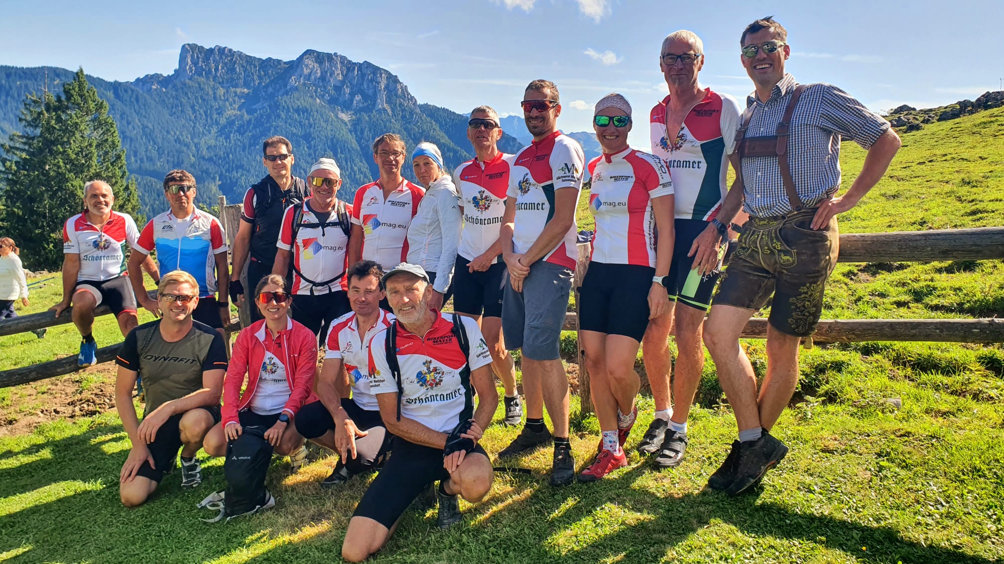 Bei noch etwas kühlen Temperaturen starteten wir um 8:30 Uhr am Dorfplatz und machten uns zunächst auf den Weg nach Teisendorf, wo wir die wartenden restlichen Mountainbiker einsammelten. Mit nun vollständiger Gruppe von 14 Mountainbikern ging es Richtung Neukirchen. Weiter führte uns die Route nach Hörgering, Ruhpolding, Maiergschwendt, Brand und Gruttau. Nun ging die Steigung los: während vier Mountainbiker einen sehr steilen Weg zur Haaralm wählten, fuhr der Großteil die „normale“ Route, die es aber hinsichtlich der Steigung auch in sich hatte. Zum Teil mussten kurze Passagen geschoben werden. Nach rund 600 Höhenmetern kamen wir schließlich alle an der Haaralm (1.325 m) an. Während ein kleiner Teil direkt in der Haaralm einkehrte, marschierten die restlichen Mountainbiker zur Haaralmschneid (ca. 300 hm) hinauf. Bei herrlichem Ausblick genossen wir die weite Sicht. Anschließend ging es für uns auch zur Stärkung zur Haaralm zurück. Da abwärts ein Weg aufgrund von Baumarbeiten gesperrt war, mussten wir kurzerhand die Strecke umplanen und wir fuhren nach Brand zurück und weiter nach Zell, am Froschsee vorbei, nach Ramsen, Inzell und schließlich über Adlgaß über die Inzeller Höhe, Anger zurück nach Teisendorf und Petting.
